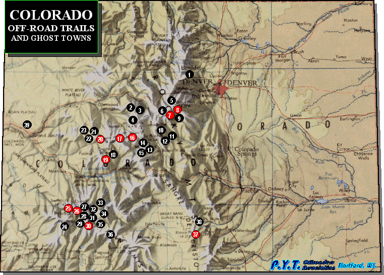 2) Holy Cross City (ghost town) 2) Holy Cross City Trail 29) Hurricane Pass 25) Imogene Pass (13,114') ** 21) Lead King Basin 23) Marble (town site) 22) Marble Quarry's 38) Medano Pass (9,950') 10) Mosquito Pass (13,186') 18) Oh-Be-Joyful Road 24) Ophir Pass (11,789') 17) Pearl Pass (12,705') **** 30) Picayune Gulch ** 27) Poughkeepsie Gulch 3) Ptarmigan Peak Trail